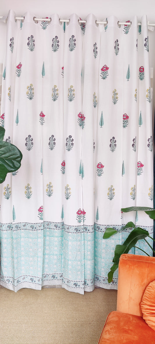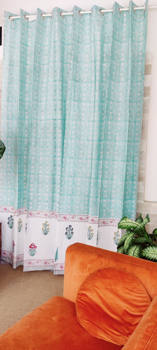 Handblockbedruckte Baumwollvorhänge – Meergrün und Weiß