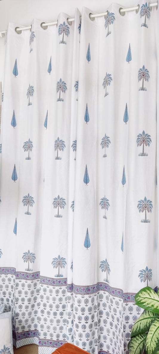HANDBLOCKBEDRUCKTE BAUMWOLLVORHÄNGE – WEISS & BLAU