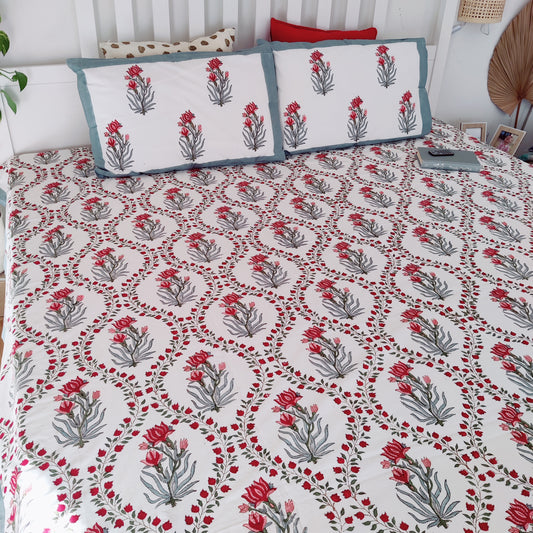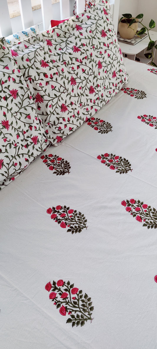 Bettlaken aus Baumwolle mit Handblockdruck in Weiß-Salbei-Rosa