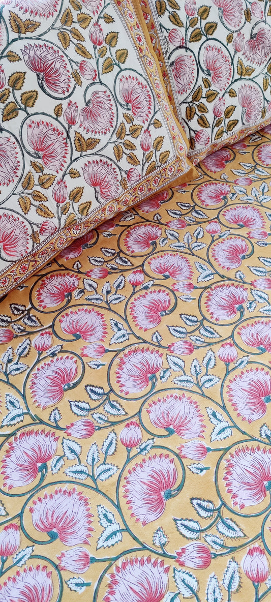 GELB-ROSA LOTUS BAUMWOLLE, HANDBLOCKDRUCK, FLACHES BLATT