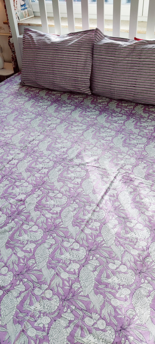 Fliederfarbenes, handblockbedrucktes Bettlaken aus Baumwolle