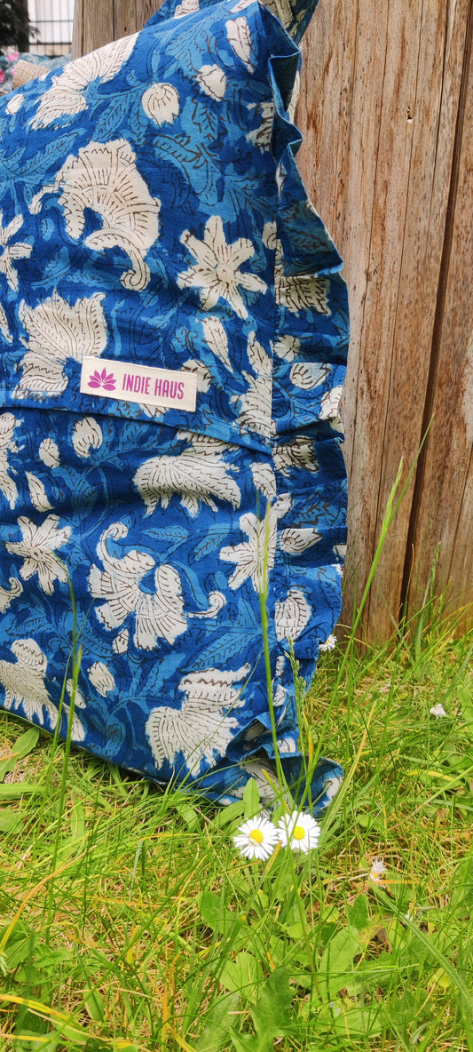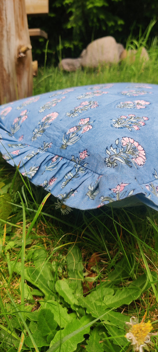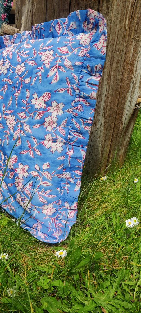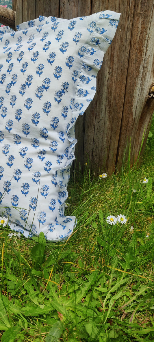 KISSENBEZUG AUS BAUMWOLLE MIT HANDBLOCKDRUCK UND RÜSCHEN - FLORA BLAU