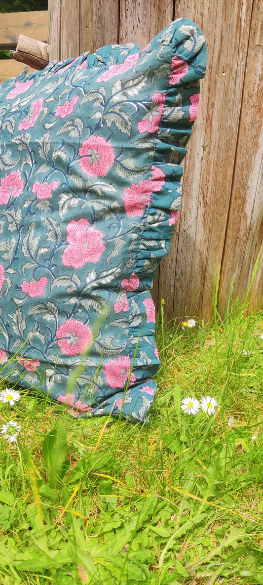 KISSENBEZUG AUS BAUMWOLLE MIT HANDBLOCKDRUCK UND RÜSCHEN - GRÜN UND ROSA