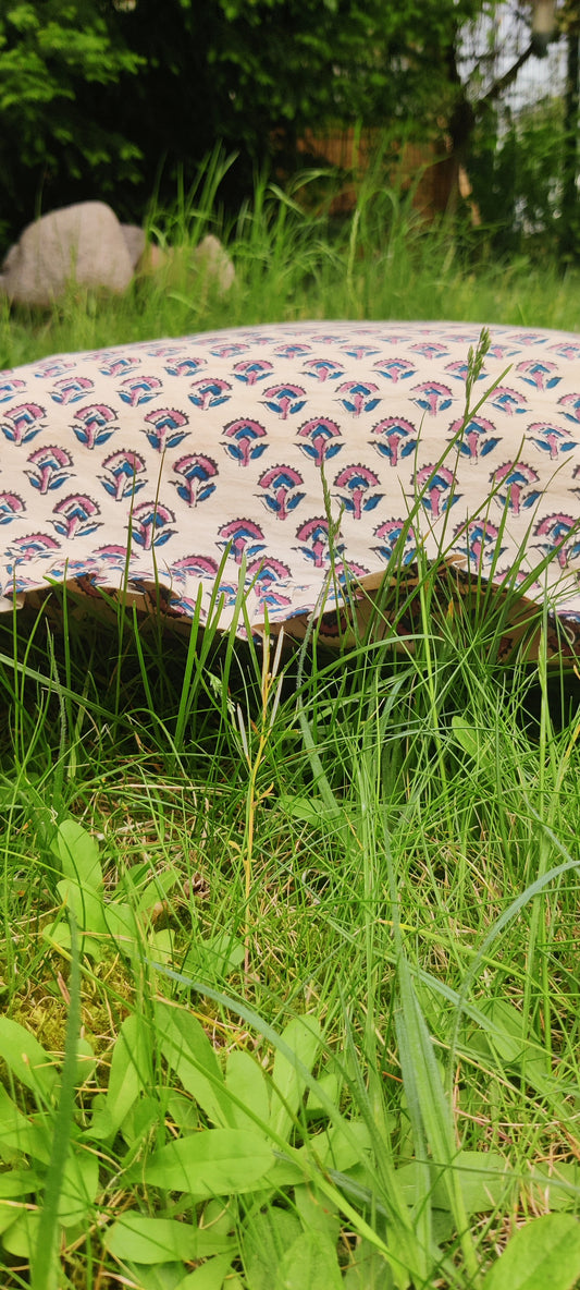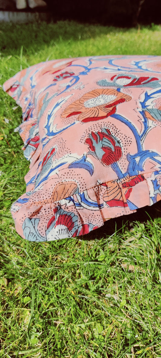 KISSENBEZUG AUS BAUMWOLLE MIT HANDBLOCKDRUCK UND RÜSCHEN - ROSA UND BLAUES MOTIV