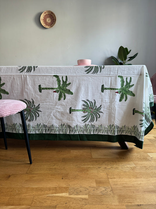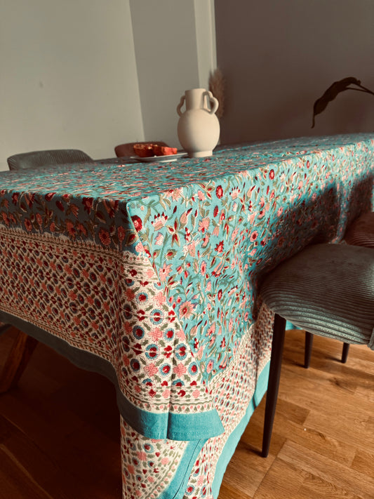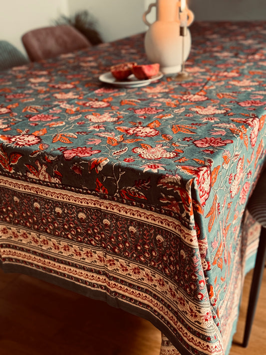 Tischdecke aus Baumwolle mit Handblockdruck in Salbeigrün