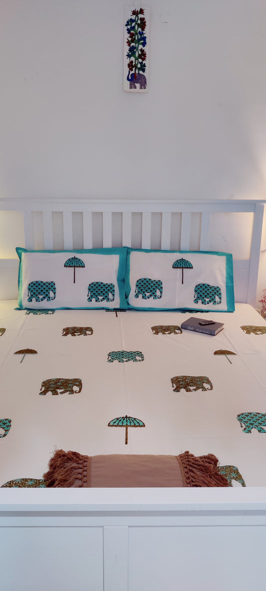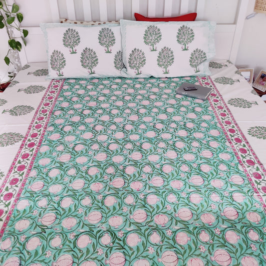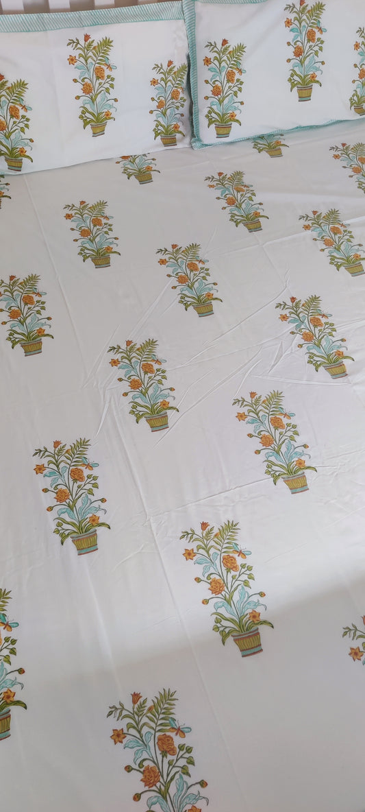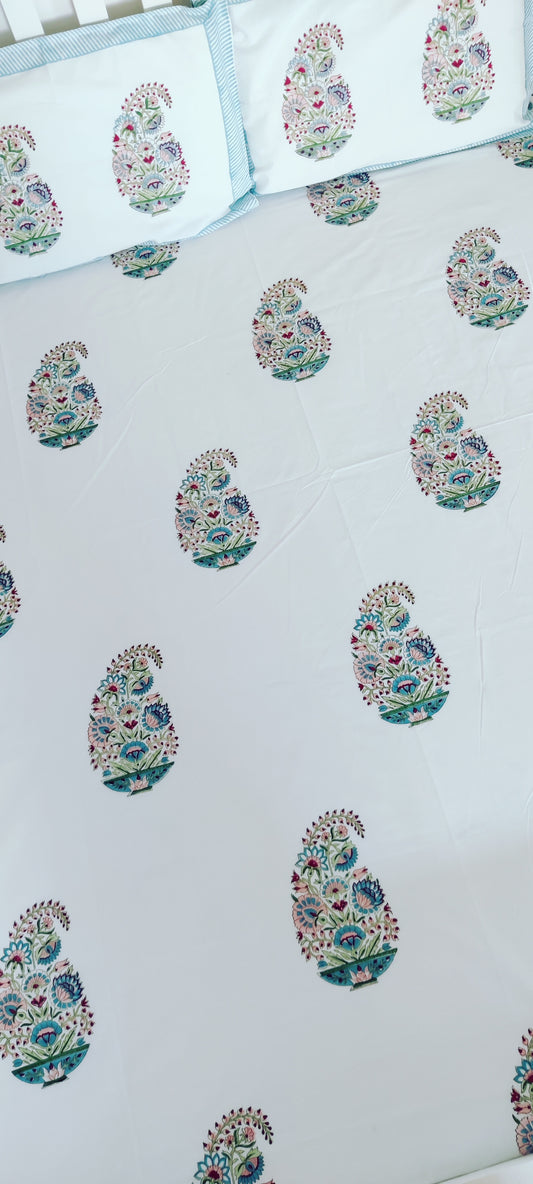 DRAP PLAT EN COTON IMPRIMÉ À LA MAIN BLANC-SAUGE-ROSE